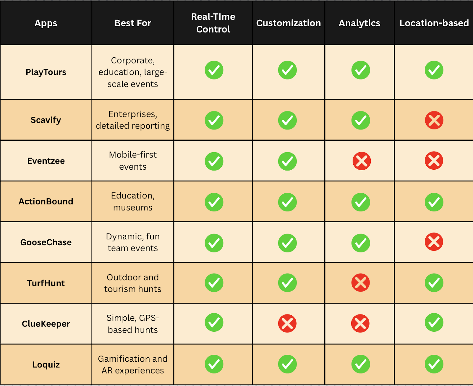 If organizer control is your top priority, PlayTours offers the most comprehensive suite of administrative tools. Its Facilitator's Dashboard provides unmatched real-time control, communication capabilities, and customization options. It can be used for personal, enterprise, educational or tourism needs.